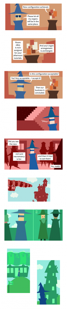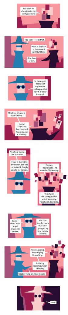 Meet Timetabling! A totally normal… um… person? Probably a person! Doing a totally normal job that doesn’t at all involve rewriting the fabric of reality on a regular basis. I can’t think why Lemrin was so reluctant to meet with him, can you?