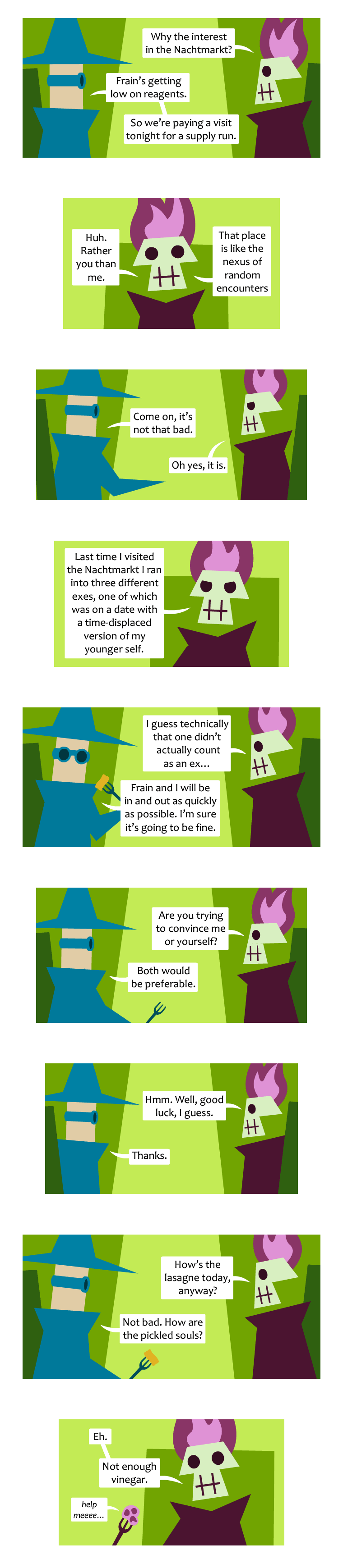 Skellaron: Last time I visited the Nachtmarkt I ran into three different exes, one of which was on a date with a time-displaced version of my younger self.